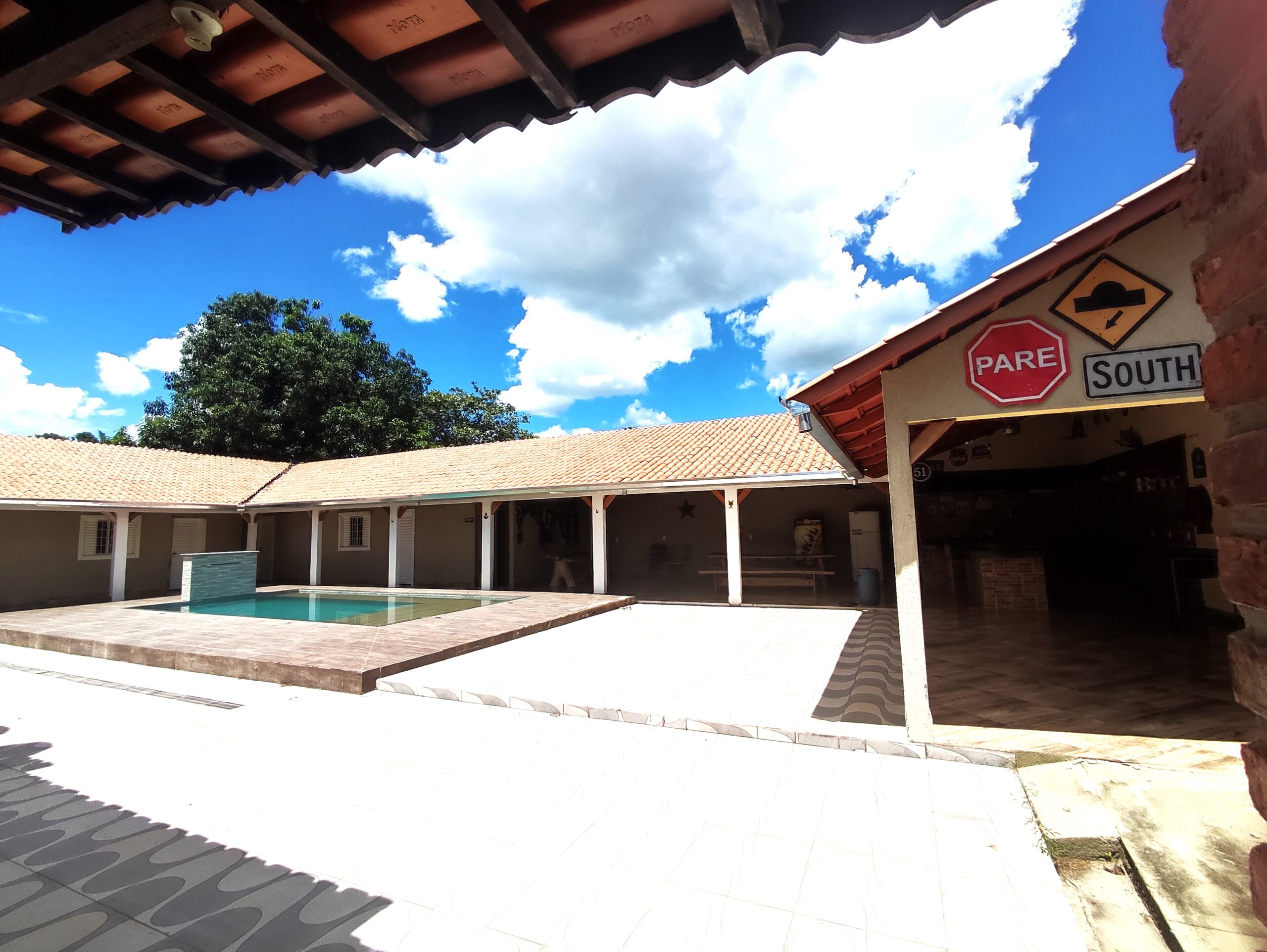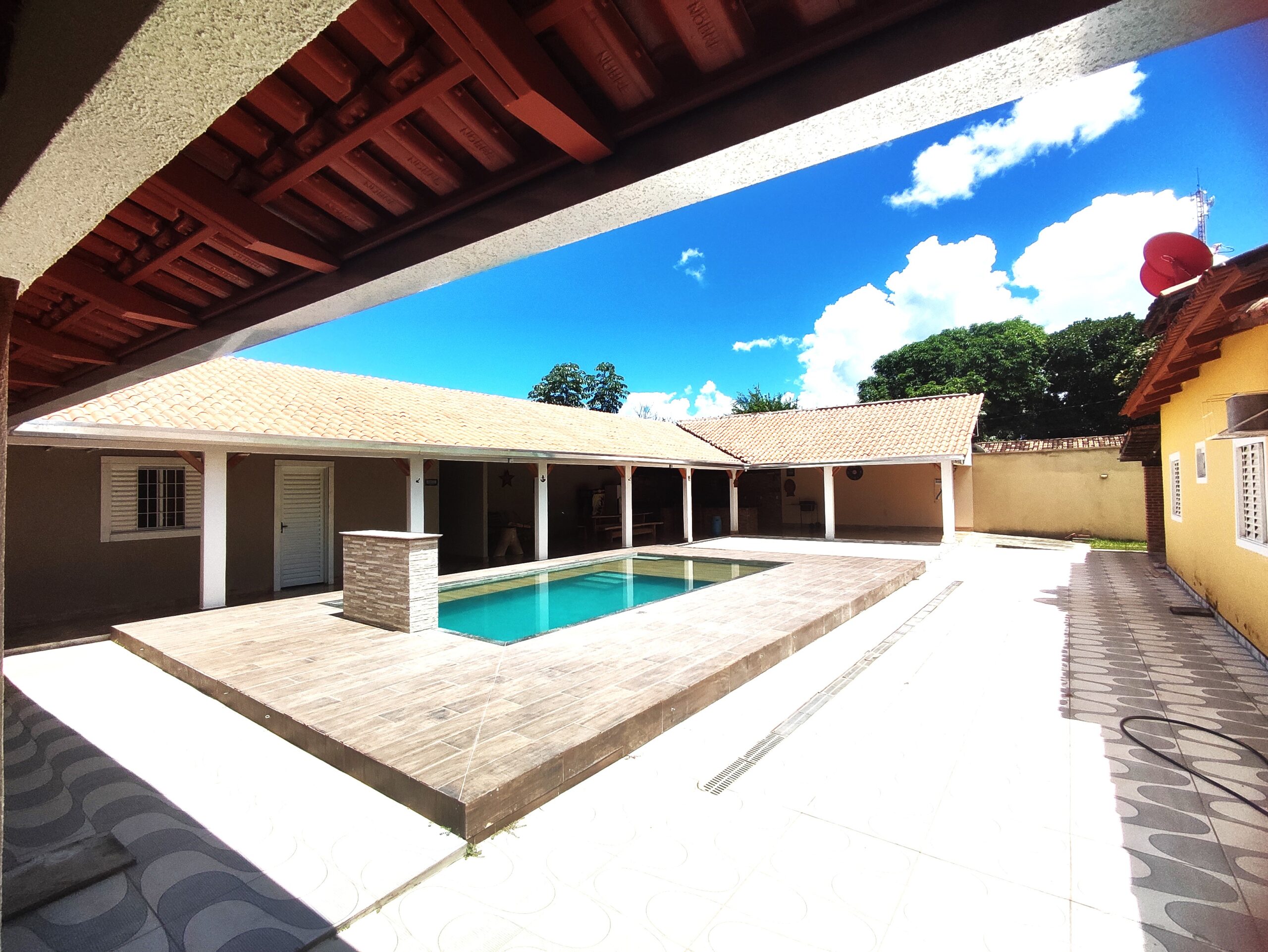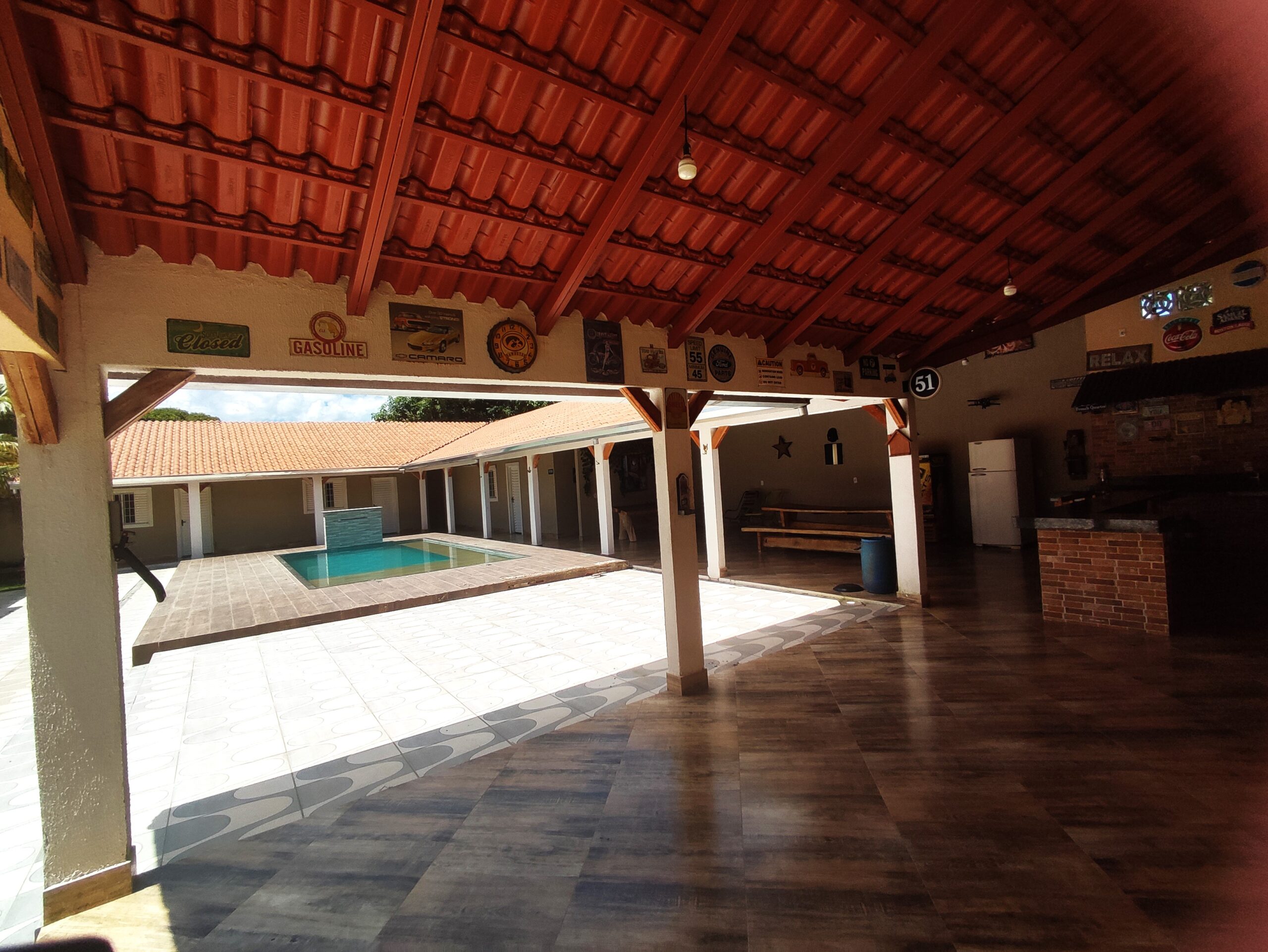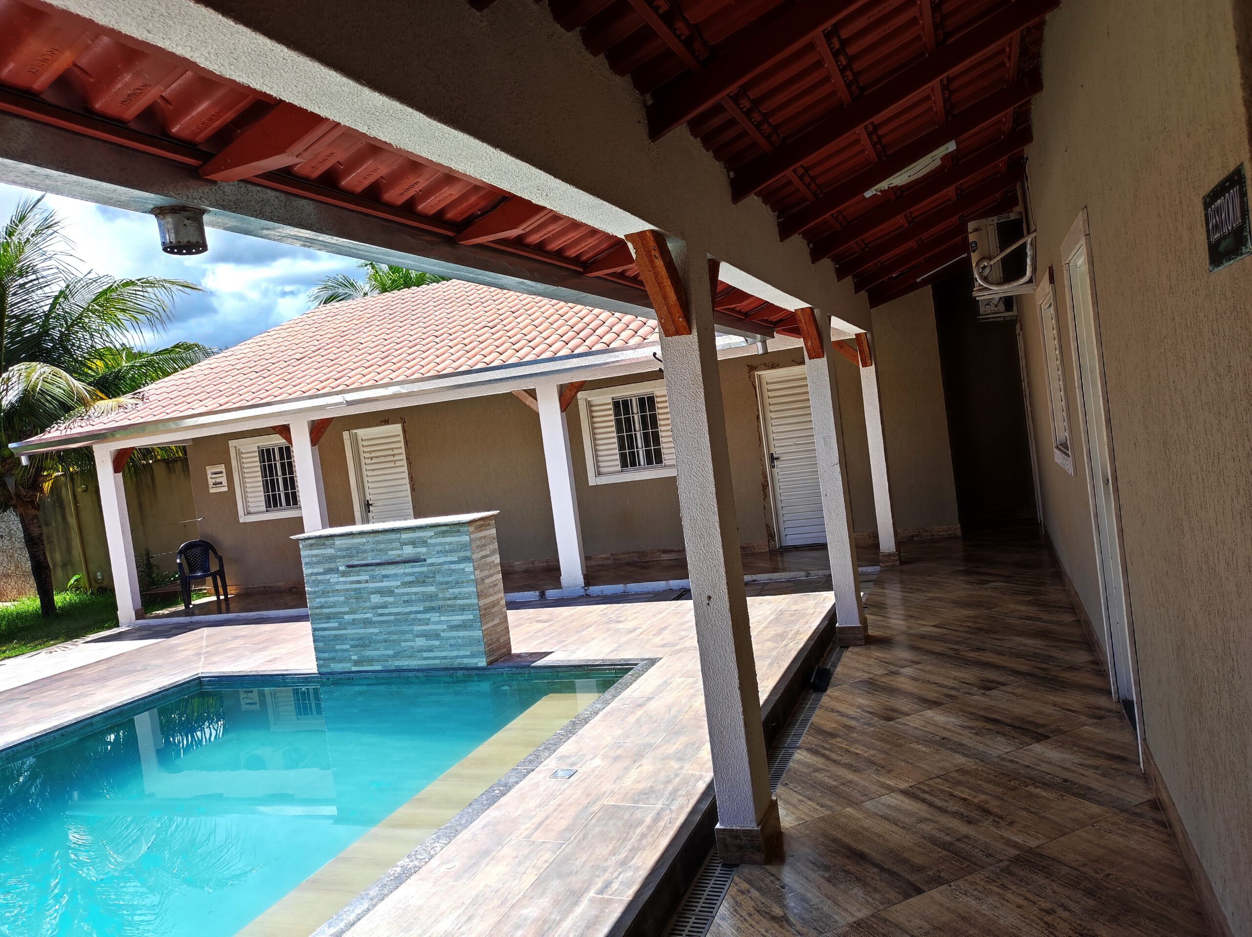Imóvel de boa qualidade de 04 suites, todos com ar condicionado,  contendo 04 camas de casal e 04 camas de solteiro box, 01 colchão extra de casal, todos com ar condiconado, banheiros social M / F, piscina, cervejeira, geladeira, amplo espaço de lazer, portão eletrônico, localizada a 3.500 m da praça central de eventos, com capacidade para 18 pessoas.