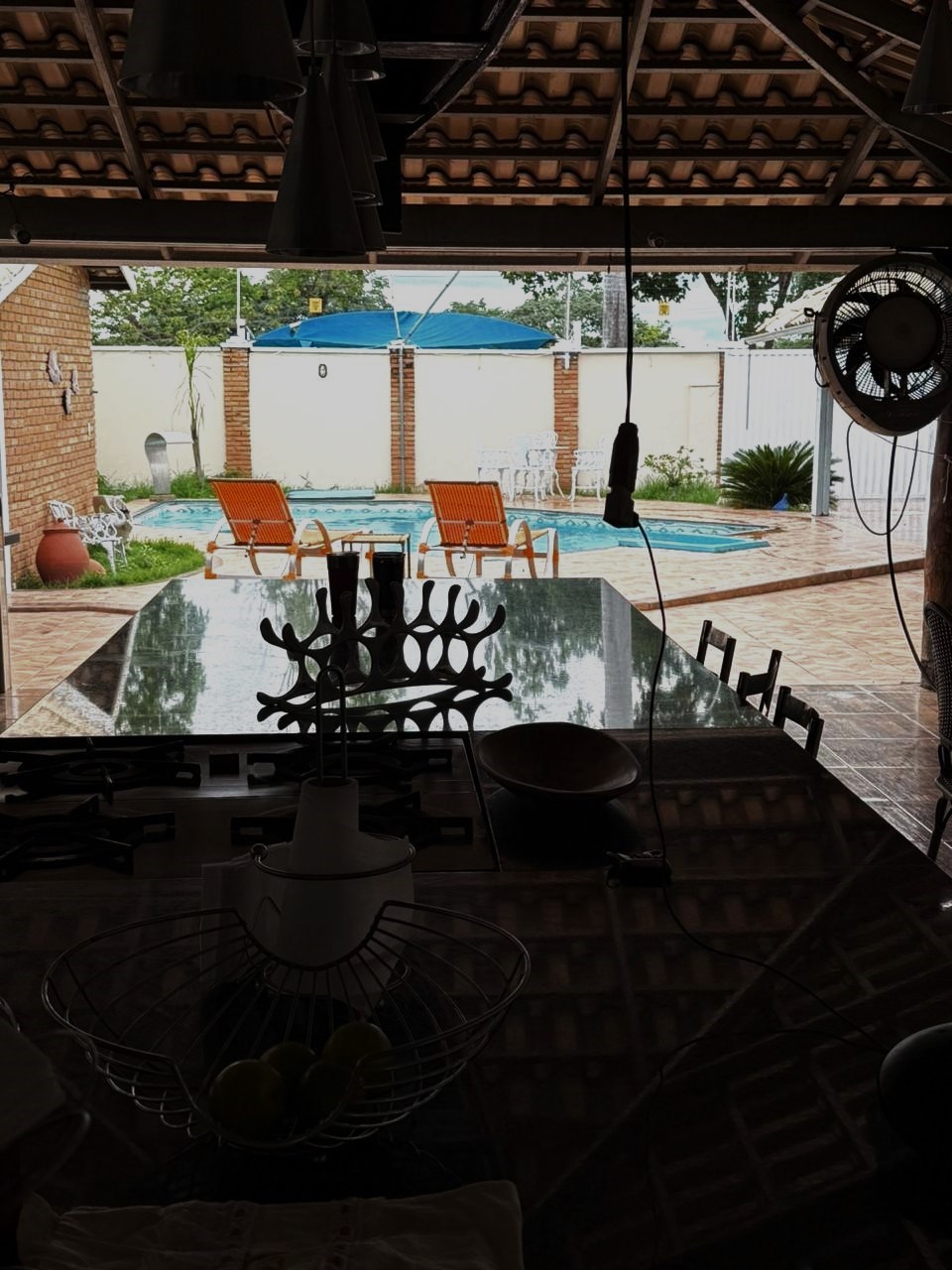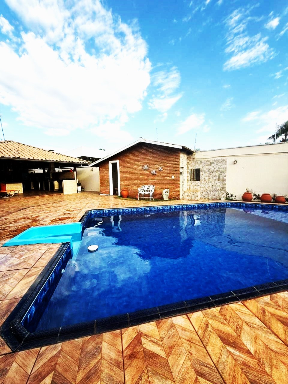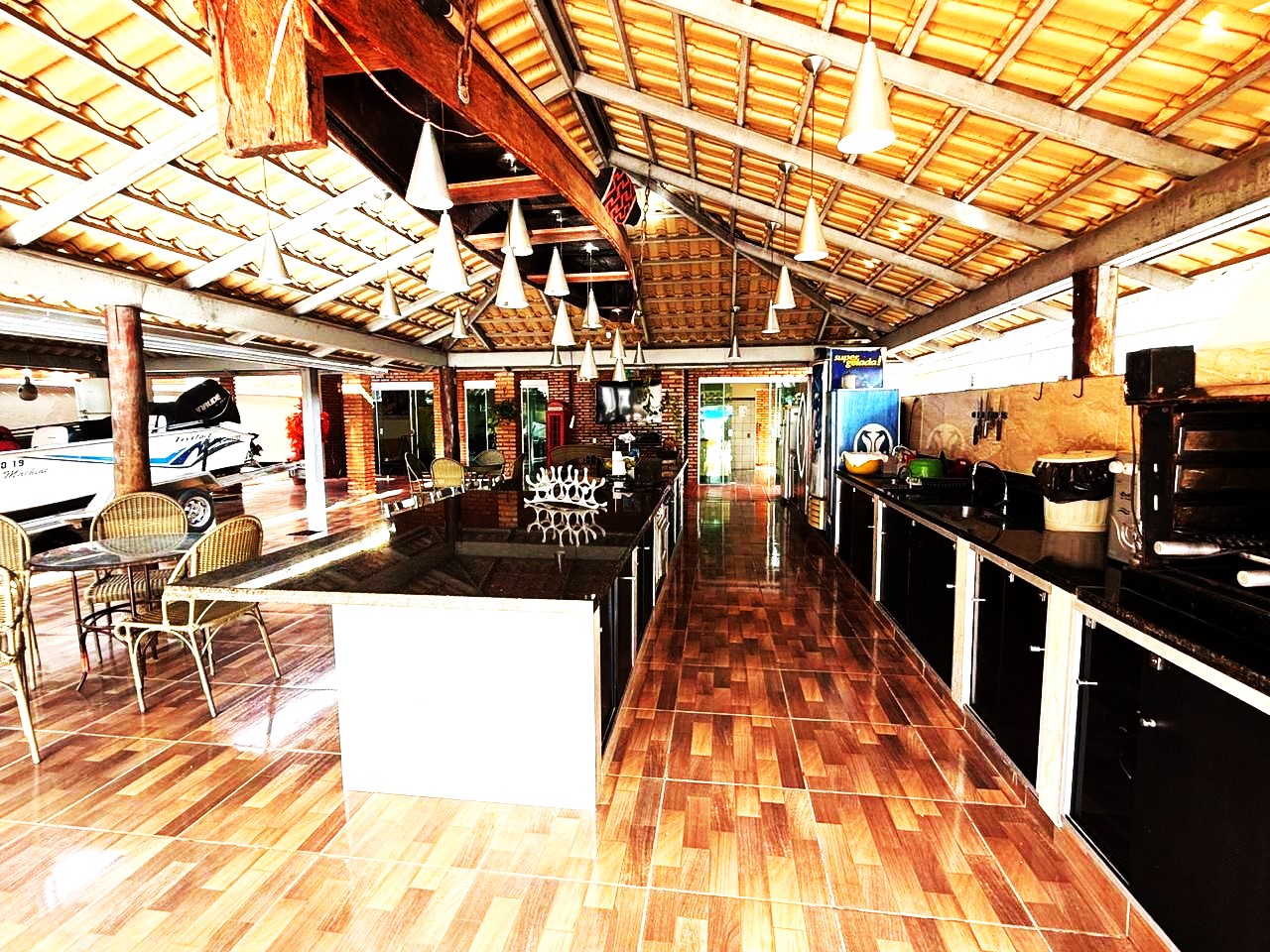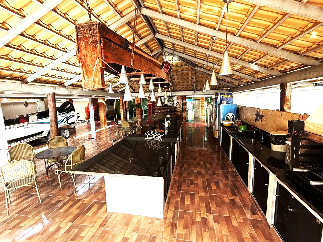 Casa de boa estrutura de 07 suites (02 suites com uma cama de casal, 02 suites com uma cama de casal e uma beliche, 03 suites com uma cama de casal e uma cama de solteiro, 03 colchões extra de solteiro), todos com ar condicionado e capacidade máxima pra até 24 pessoas, piscina, cozinha equipada, internet wi-fi, 50 mts das margens do rio Araguaia (porto da Aspega).
